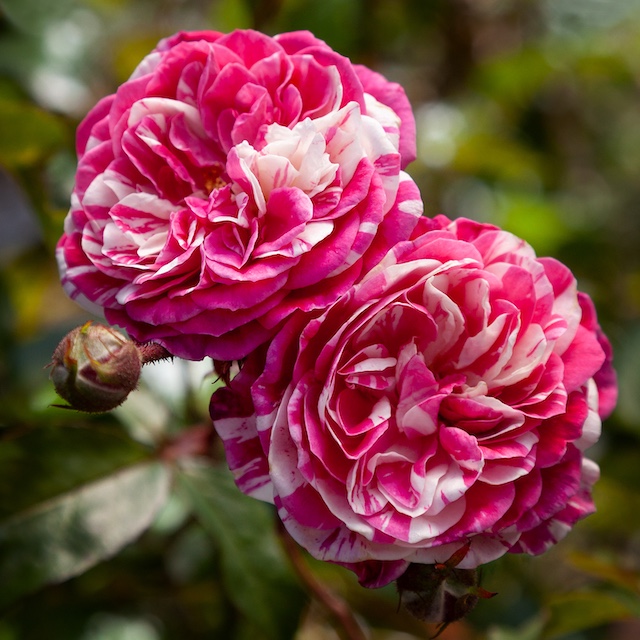 Petite multi-petal blooms of berry-pink striped with cream, repeat flower in clusters borne on long stems – fun for something different to pick! Rich dark foliage, robust growing plant. A unique addition to the patio climber range. Bred in NZ by Bob Matthews.